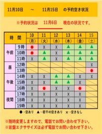 11月10日(月)~11月15日(土)の空き状況をお知らせします。
