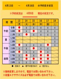4月13日(月)~4月18日(土)の空き状況をお知らせします。