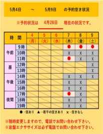 5月4日(月)~5月9日(土)の空き状況をお知らせします。